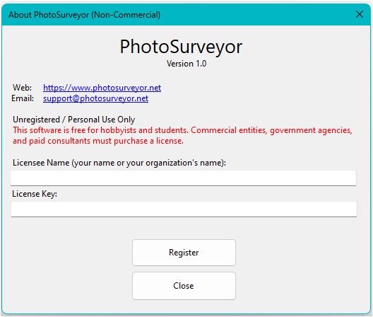 PhotoSurveyor is free for hobbyists and students. Commercial entities, government agencies, and paid consultants are required to purchase a license for professional use.